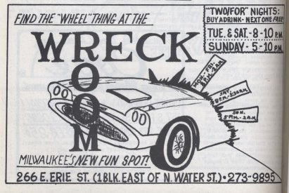 | Advertisement for The Wreck Room; first known image of the front end of the car which actually comes out of a wall inside the bar