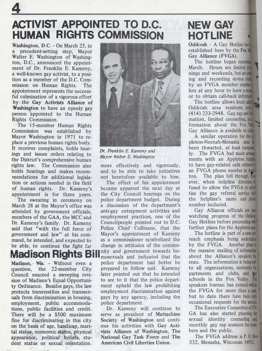 News: Madison City Council passes law to protect gays, transvestities and transexuals from discrimintation; Gay Hot Line started by Fox Valley Gay Alliance (FVGA)