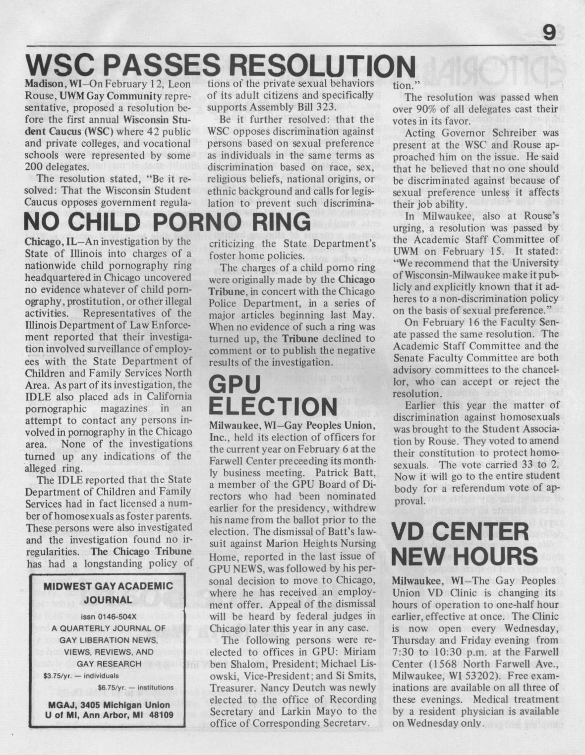 Note: The GPU News was nationally distributed, and included a high percentage of general content: gay and lesbian news from other cities and states, original fiction, stories, and poetry, etc. The excerpts presented here are concentrated on local interest (Milwaukee and Wisconsin). Those so inclined are encouraged to visit the UWM Libraries- Special Collections Department in Milwaukee to view the complete issues, which include all of the general interest materials not included here.