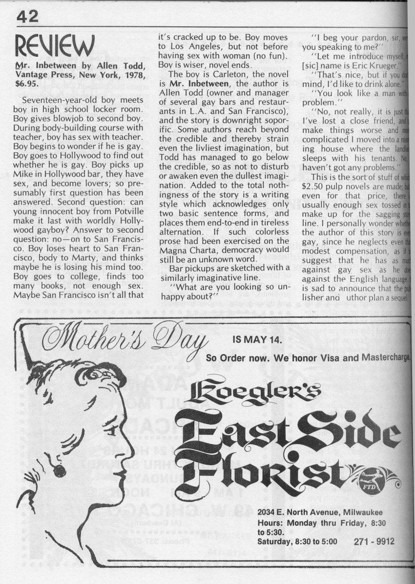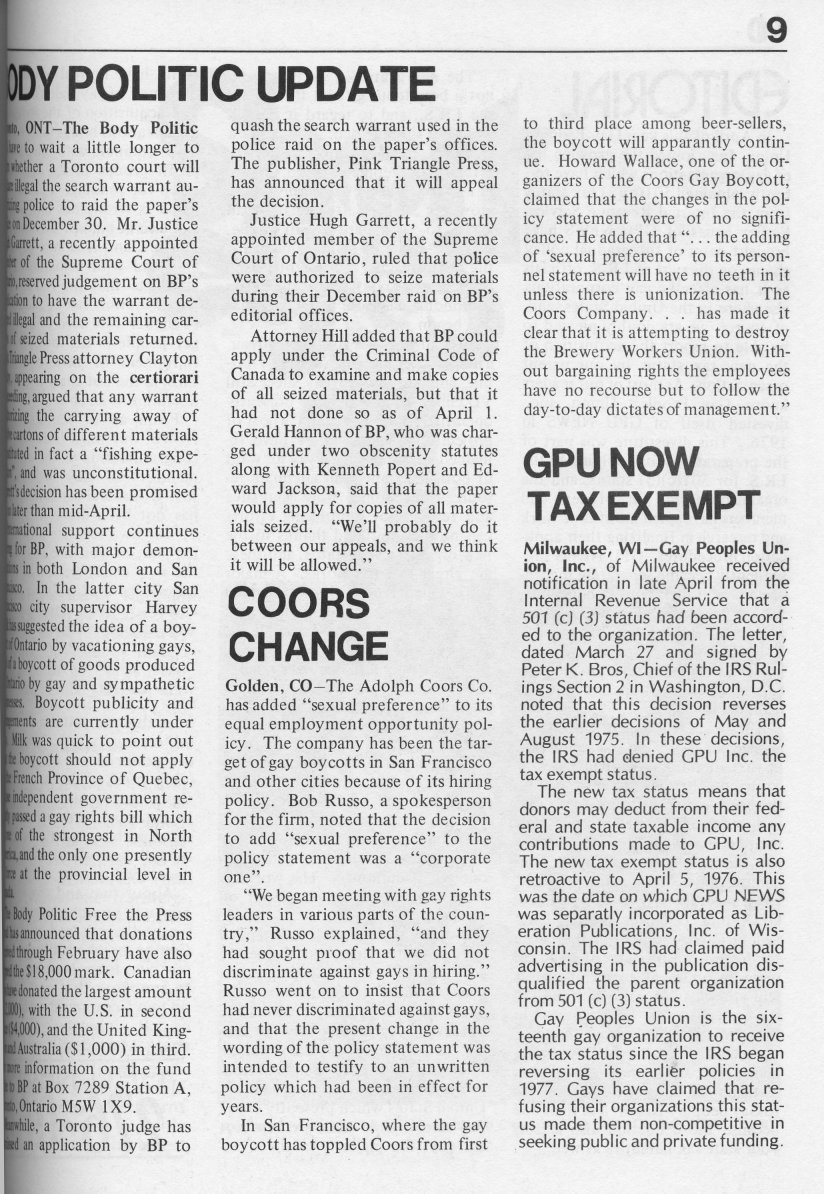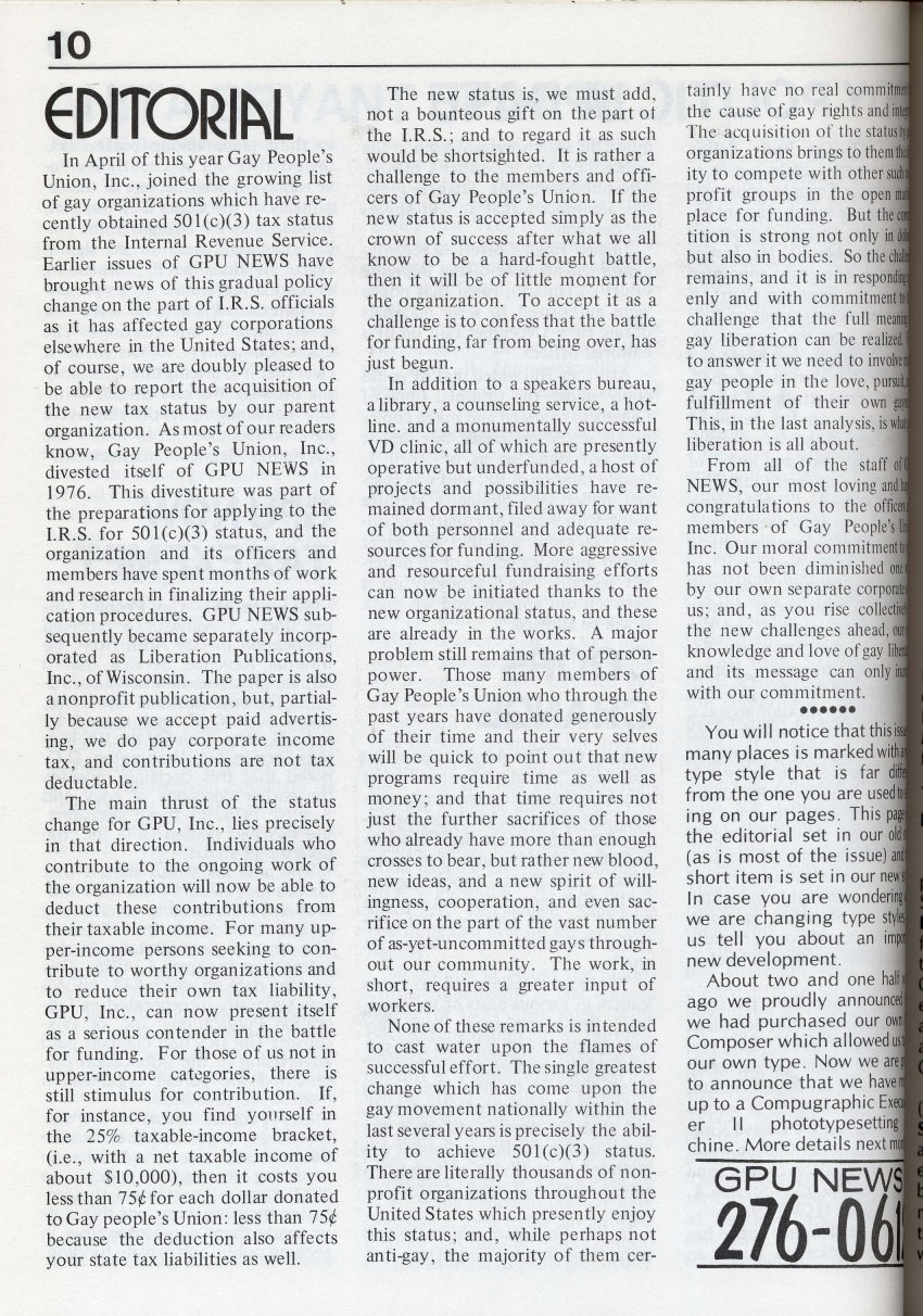 Note: The GPU News was nationally distributed, and included a high percentage of general content: gay and lesbian news from other cities and states, original fiction, stories, and poetry, etc. The excerpts presented here are concentrated on local interest (Milwaukee and Wisconsin). Those so inclined are encouraged to visit the UWM Libraries- Special Collections Department in Milwaukee to view the complete issues, which include all of the general interest materials not included here.