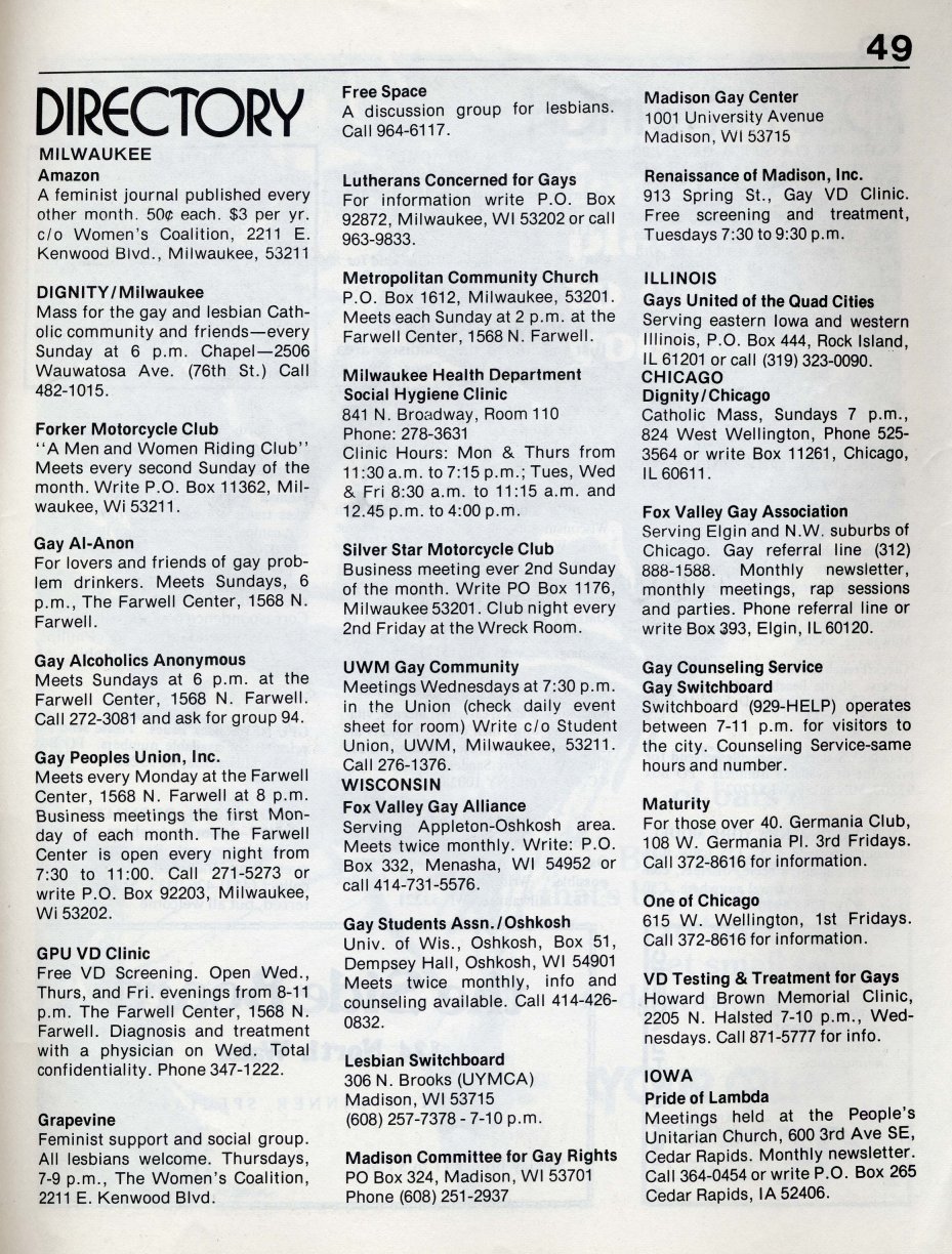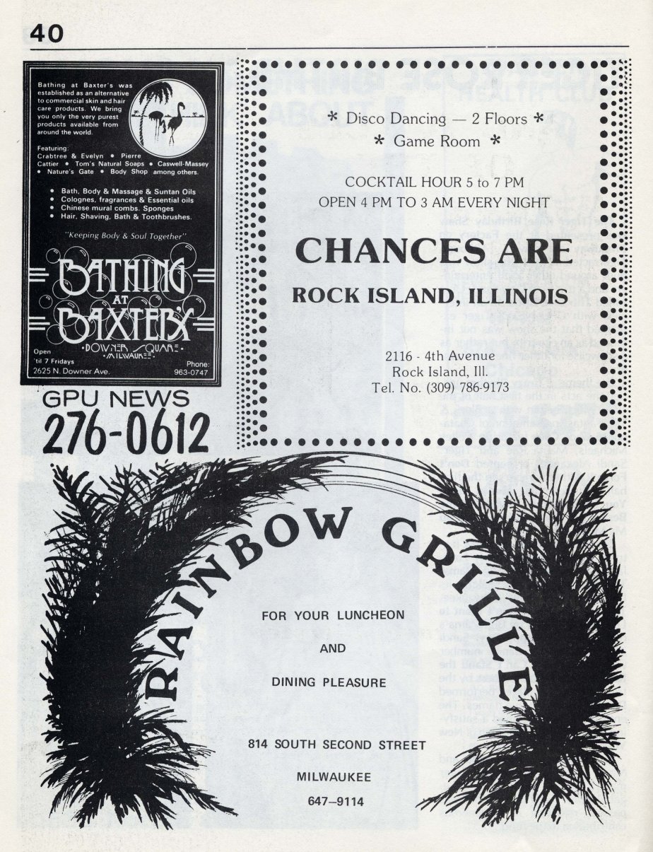 Note: The GPU News was nationally distributed, and included a high percentage of general content: gay and lesbian news from other cities and states, original fiction, stories, and poetry, etc. The excerpts presented here are concentrated on local interest (Milwaukee and Wisconsin). Those so inclined are encouraged to visit the UWM Libraries- Special Collections Department in Milwaukee to view the complete issues, which include all of the general interest materials not included here.