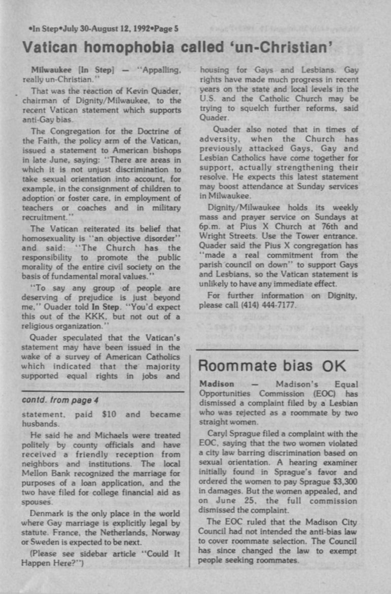 Dignity/ Milwaukee reacts to Vatican statement on anti-gay bias; lesbian roomie in Madison (page 5)
