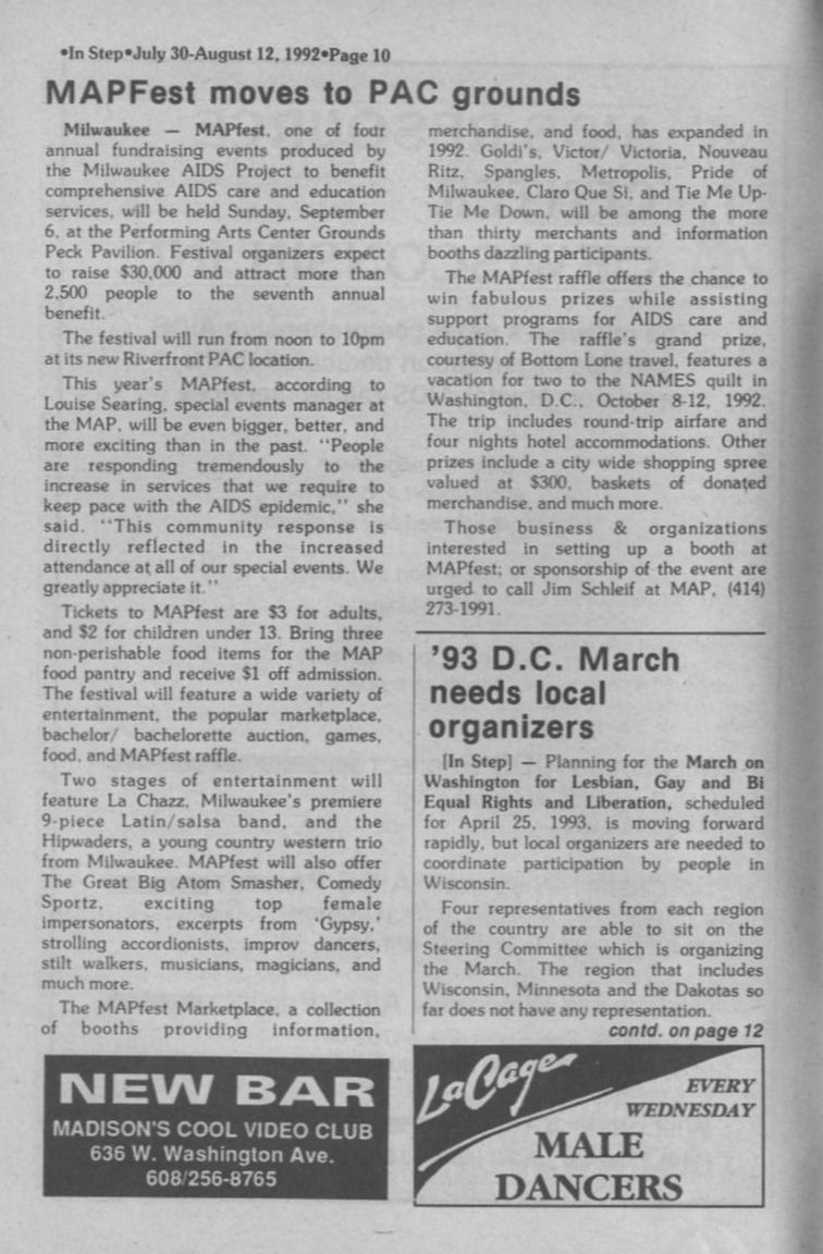 Challenging party raises funds for ARCW and LAMM; "Women Allowed" AIDS workshop held; MLGPC/ Pride group seeks 1993 theme (page 24)