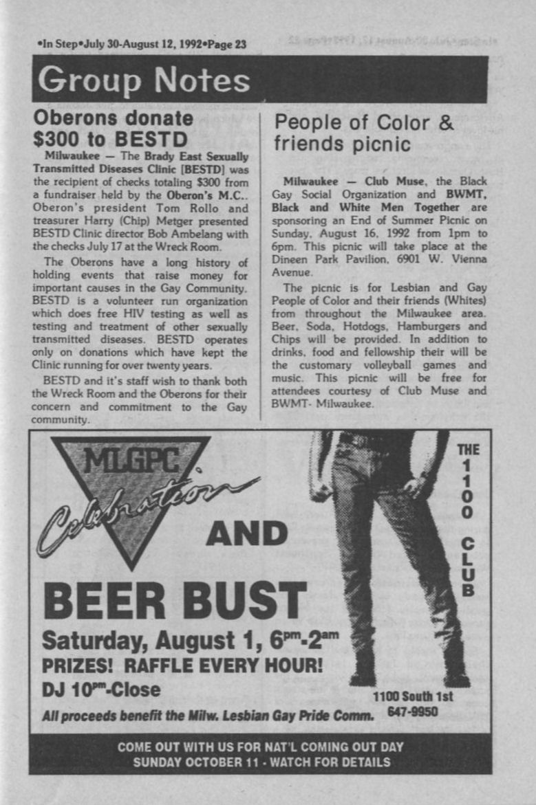 Oberons donate $300 to BESTD Clinic; People of Color/ Club MUSE and BWMT Picnic (page 23)