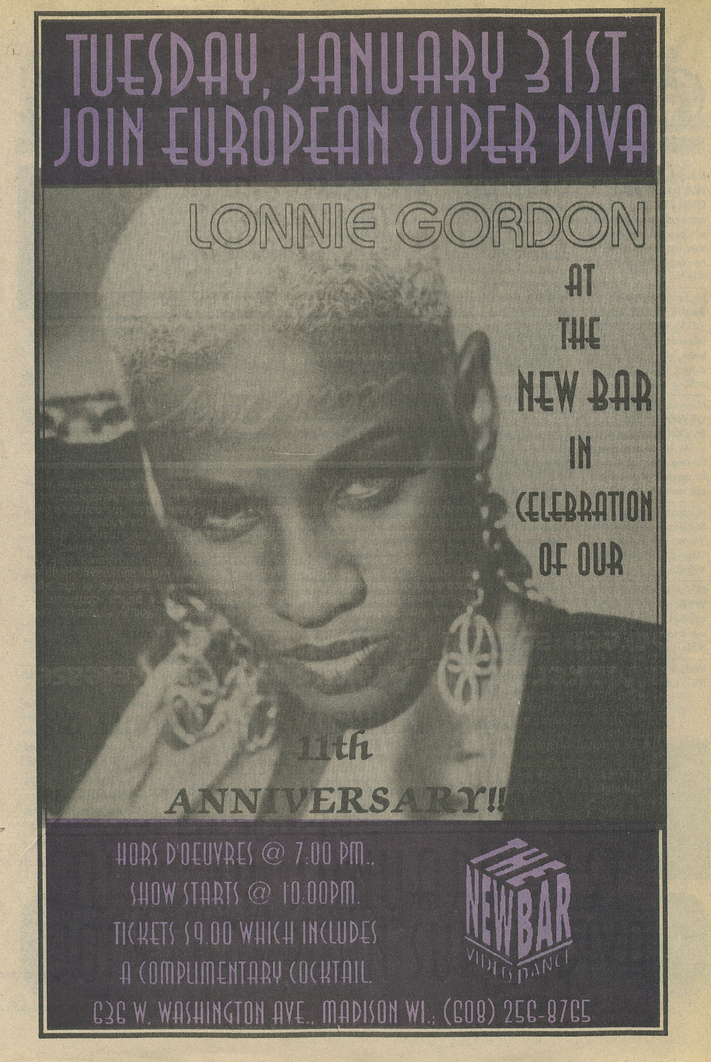 Ad: New Bar, Madison, 11th anniversary; Lonnie Gordon