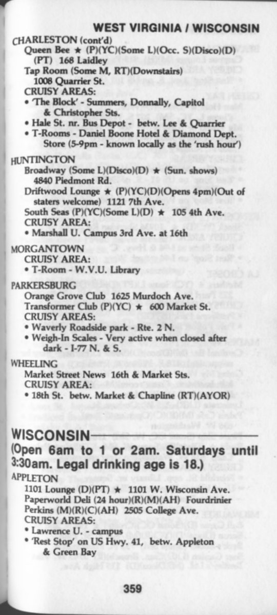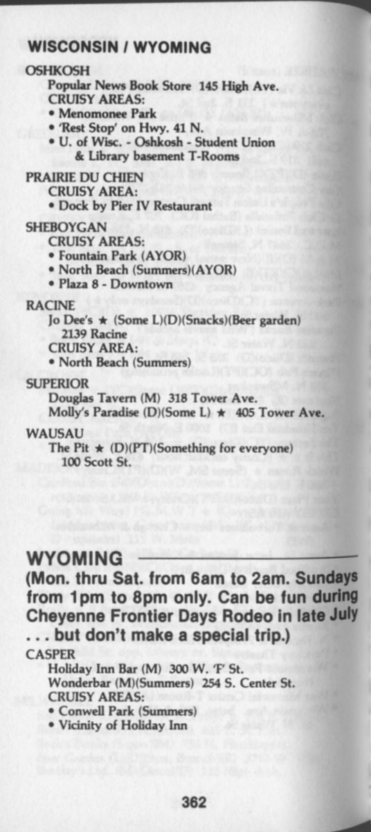 The first issue of this locally/ Milwaukee-produced publication provides a rare glimpse of the city's gay life at that time: an accurate local listing of organizations and businesses, informational text about many of the bars, plus rare photos of the interiors of many bars. No second issue has ever been located.