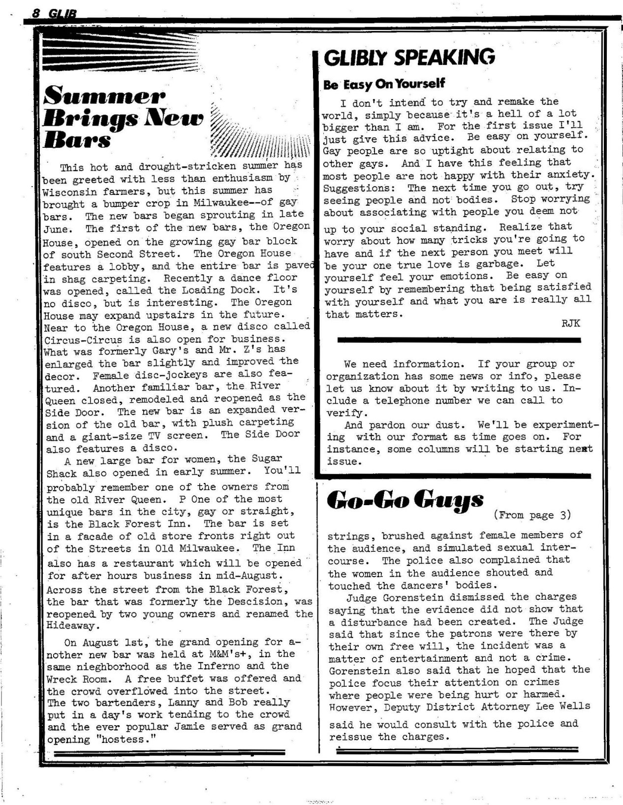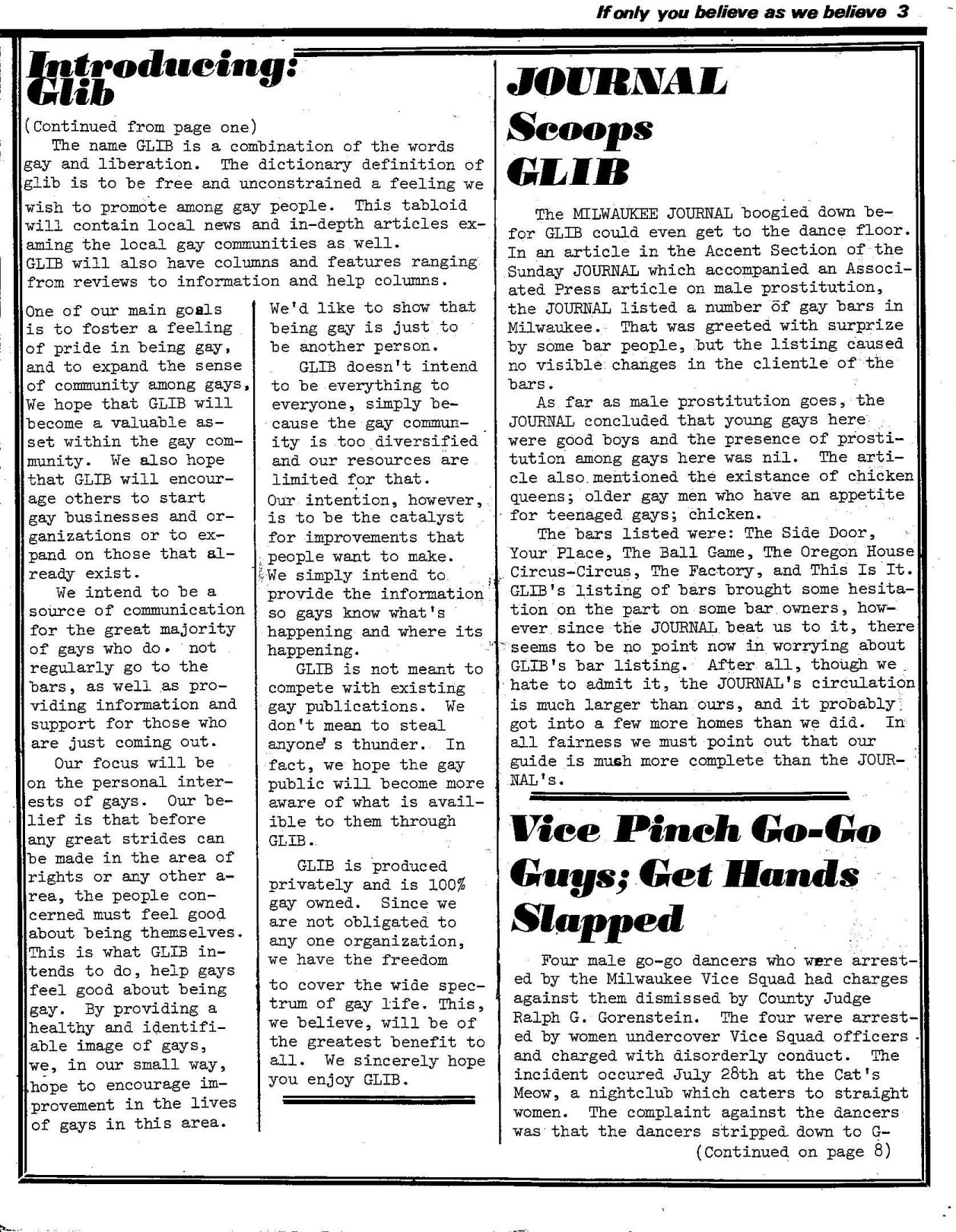 Introducing "Glib"; + Journal scoops Glib by publishing list of gay bars; + Four male Go-Go dancers are arrested at straight night club catering to women (page 3)