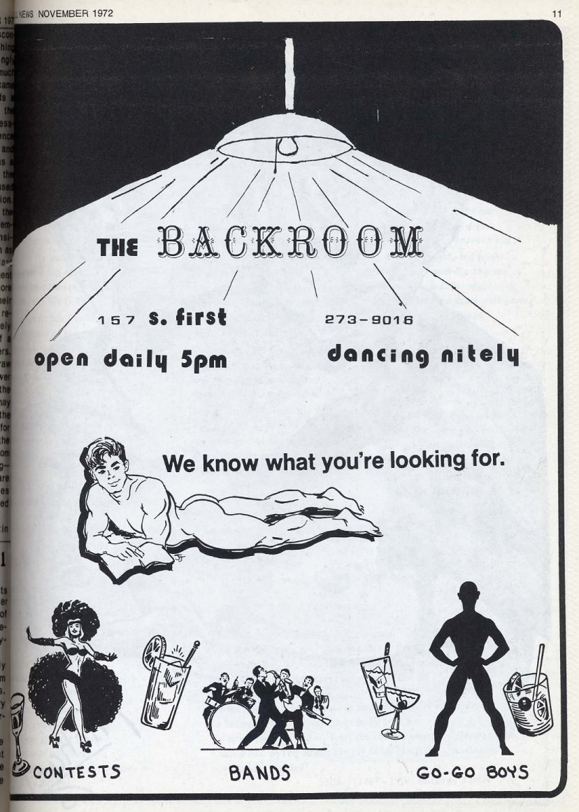 Advertisement for the BackRoom bar in Milw ("We know what you're looking for- Contests, Bands, Go-go Boys")