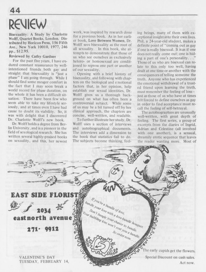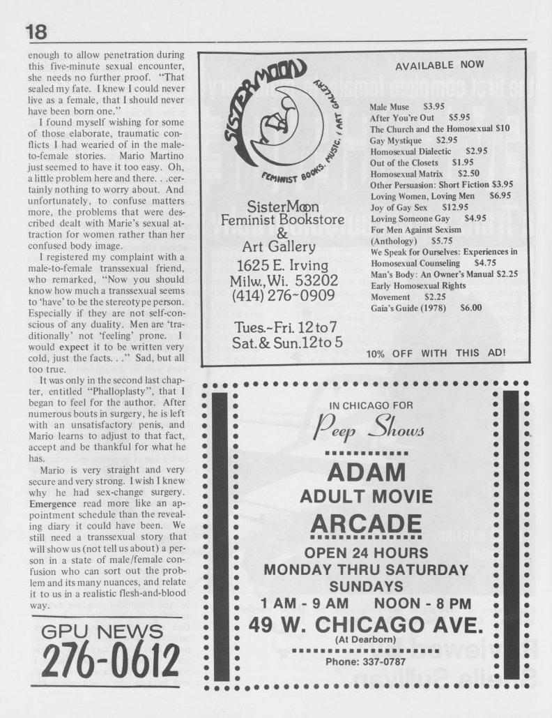 Note: The GPU News was nationally distributed, and included a high percentage of general content: gay and lesbian news from other cities and states, original fiction, stories, and poetry, etc. The excerpts presented here are concentrated on local interest (Milwaukee and Wisconsin). Those so inclined are encouraged to visit the UWM Libraries- Special Collections Department in Milwaukee to view the complete issues, which include all of the general interest materials not included here.