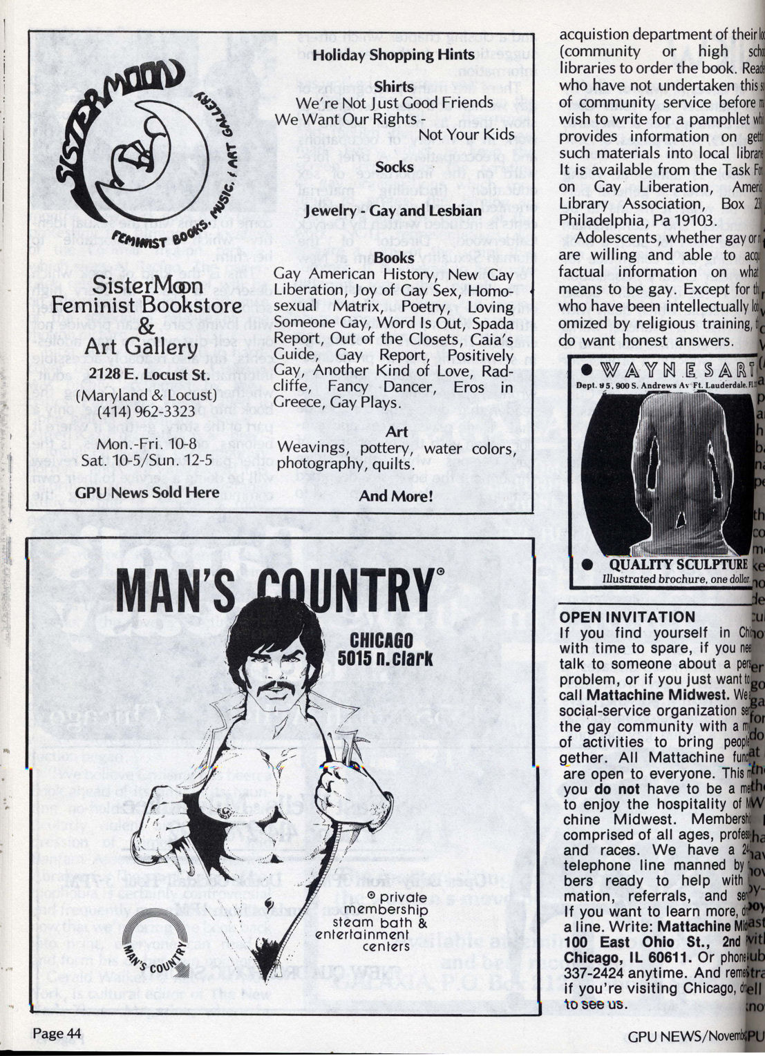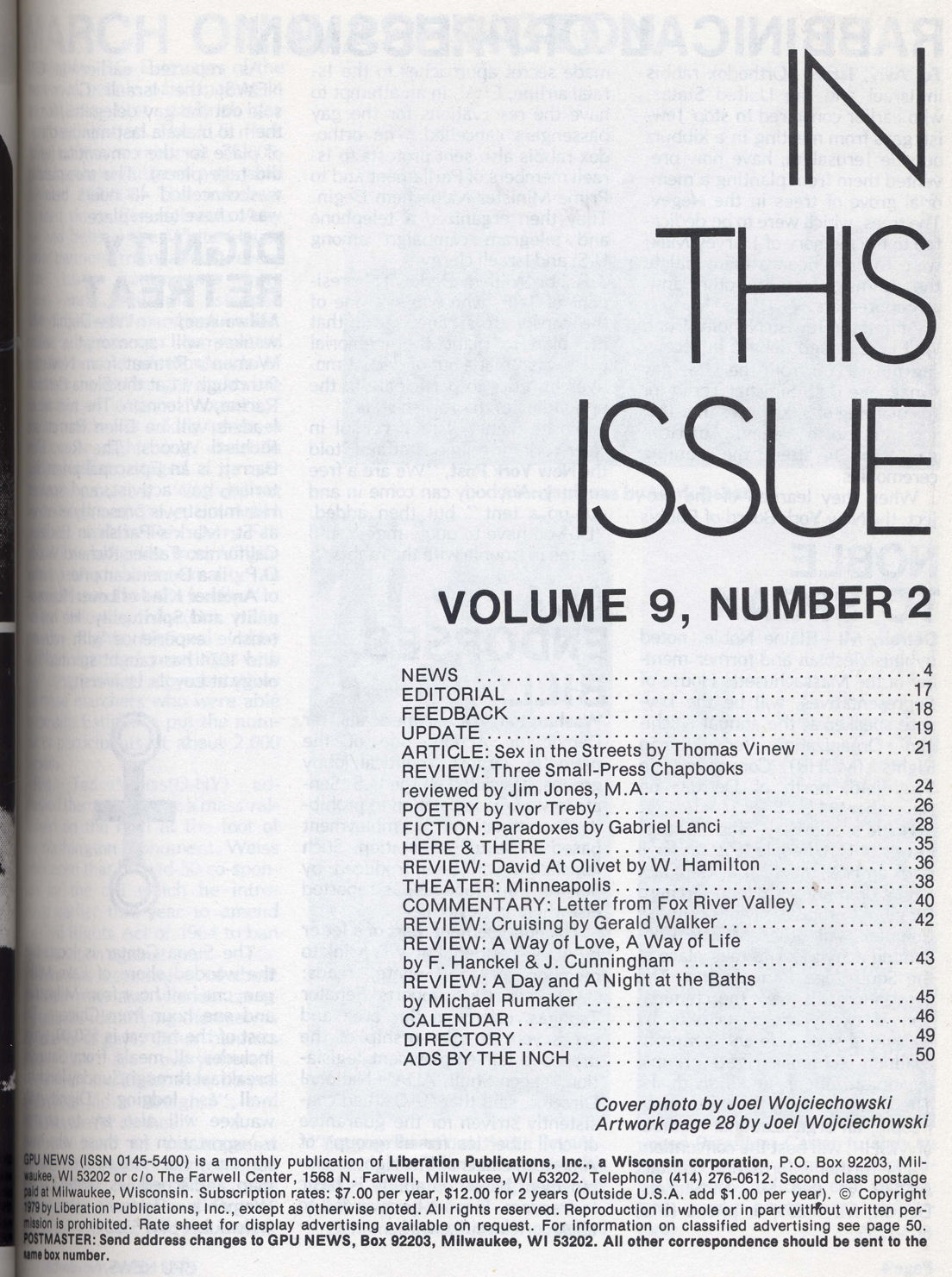 Note: The GPU News was nationally distributed, and included a high percentage of general content: gay and lesbian news from other cities and states, original fiction, stories, and poetry, etc. The excerpts presented here are concentrated on local interest (Milwaukee and Wisconsin). Those so inclined are encouraged to visit the UWM Libraries- Special Collections Department in Milwaukee to view the complete issues, which include all of the general interest materials not included here. <--Excerpts from Previous issue Excerpts from Next issue--> Return to GPU News cover gallery. Credits: Later covers and content of GPU News copyrighted; | |||||||||||||||||||||||||||||