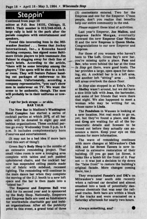Steppin' Out-- bar changes underway: New Bar in Madison, Body Shop in Green Bay remodeling; Emperor and Empress Ball; The Loft and Trix's bars in Green Bay; Pendulum in Wausau; Club 219 and 1st Street Tavern remodeling; Fannie's and DK's evacuated.