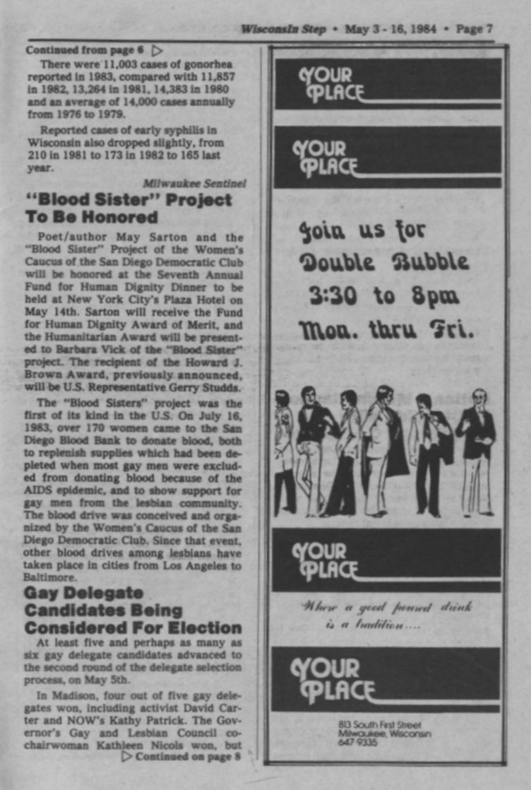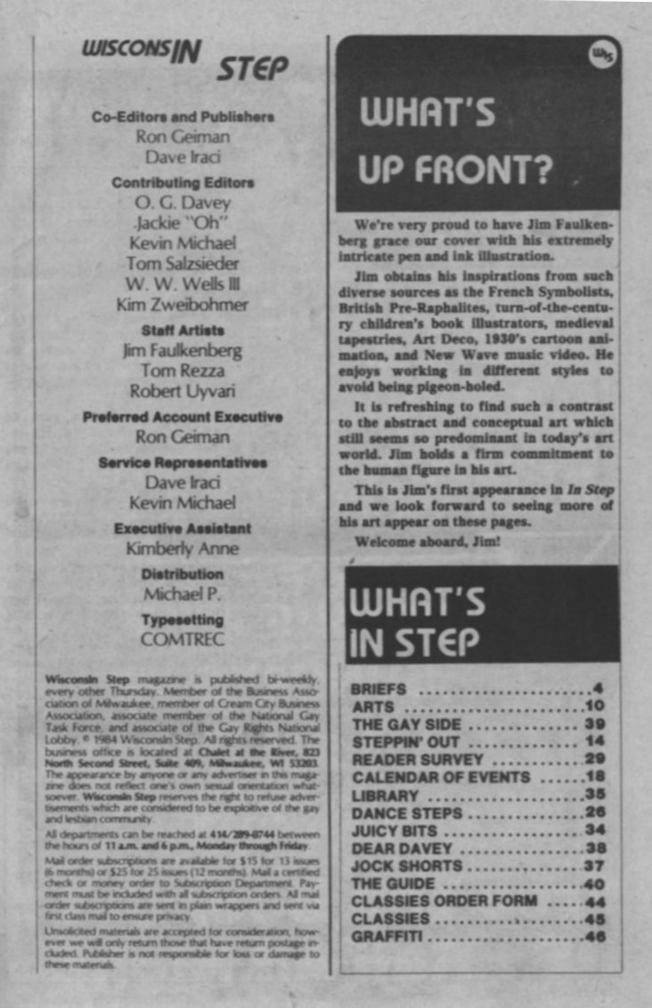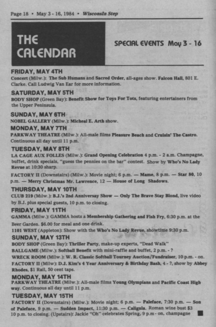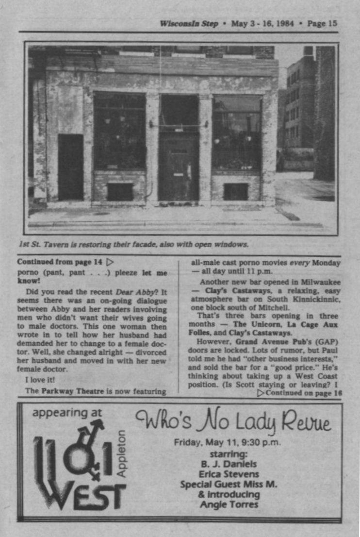 Steppin' Out, cont.: Parkway theatre all-male movies; new bar Clay's Castaways; Grand Avenue Pub closed and sold;