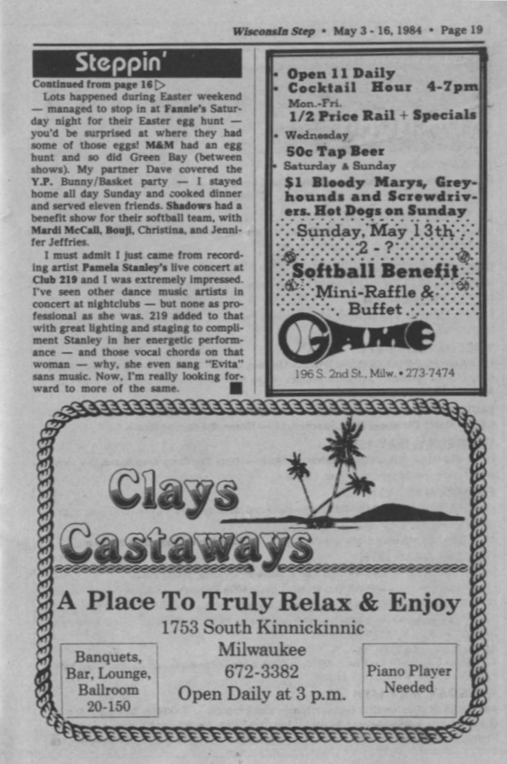 Steppin' Out, cont.: M+M renovations and opens up windows; La Cage grand opening; Sam's in Madison being sold; New Bar in Madison; Emily's in Madison, the Shack in Kenosha, Wreck Room and Jodees;