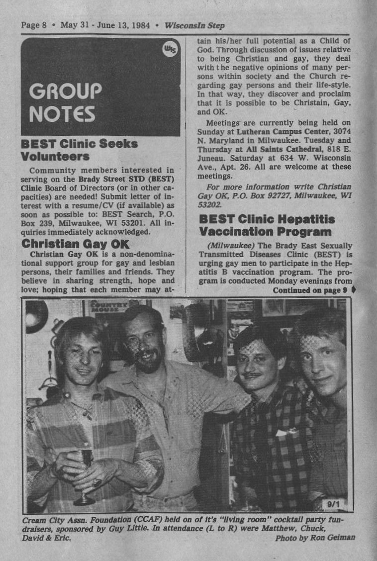Photo: Cream City Association Foundation (CCAF) holds living room fundraiser, sponsored by Guy Little: pictured are Matthew, Chuck, David & Eric