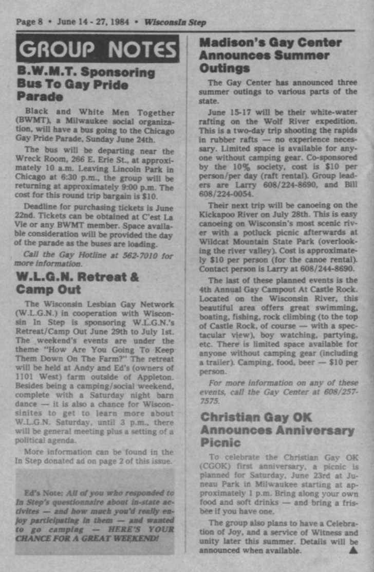 Group Notes: BWMT (Black and White Men Together) sponsoring bus to Chicago pride; WLGN (Wis Lesbian Gay Network) retreat and campout; Madison's Gay Center announces summer outings; Christian Gay OK celebrates first anniversary