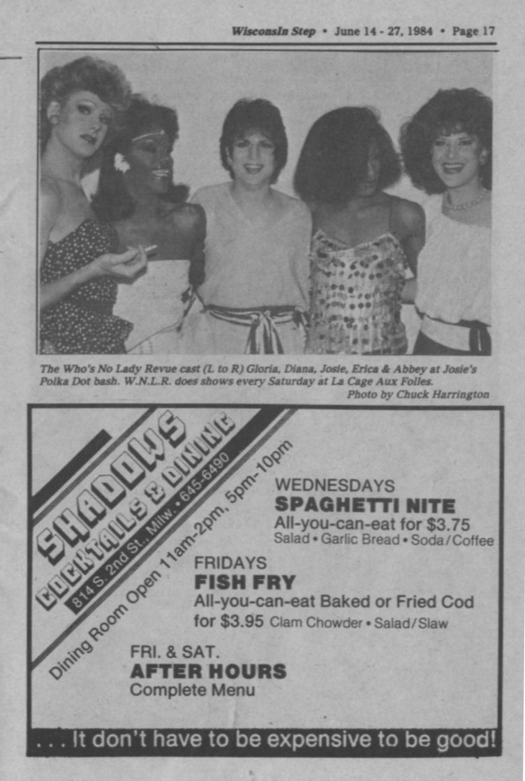 Photo: Who's No Lady Revue case at La Cage Aux Folles; + Ad: Shadows cocktails & dining