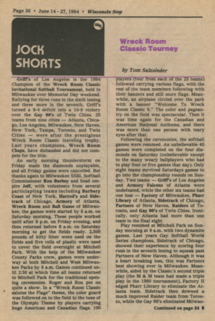 Jock Shorts: results of 1984 Wreck Room Classic Invitational Softball Tournament
