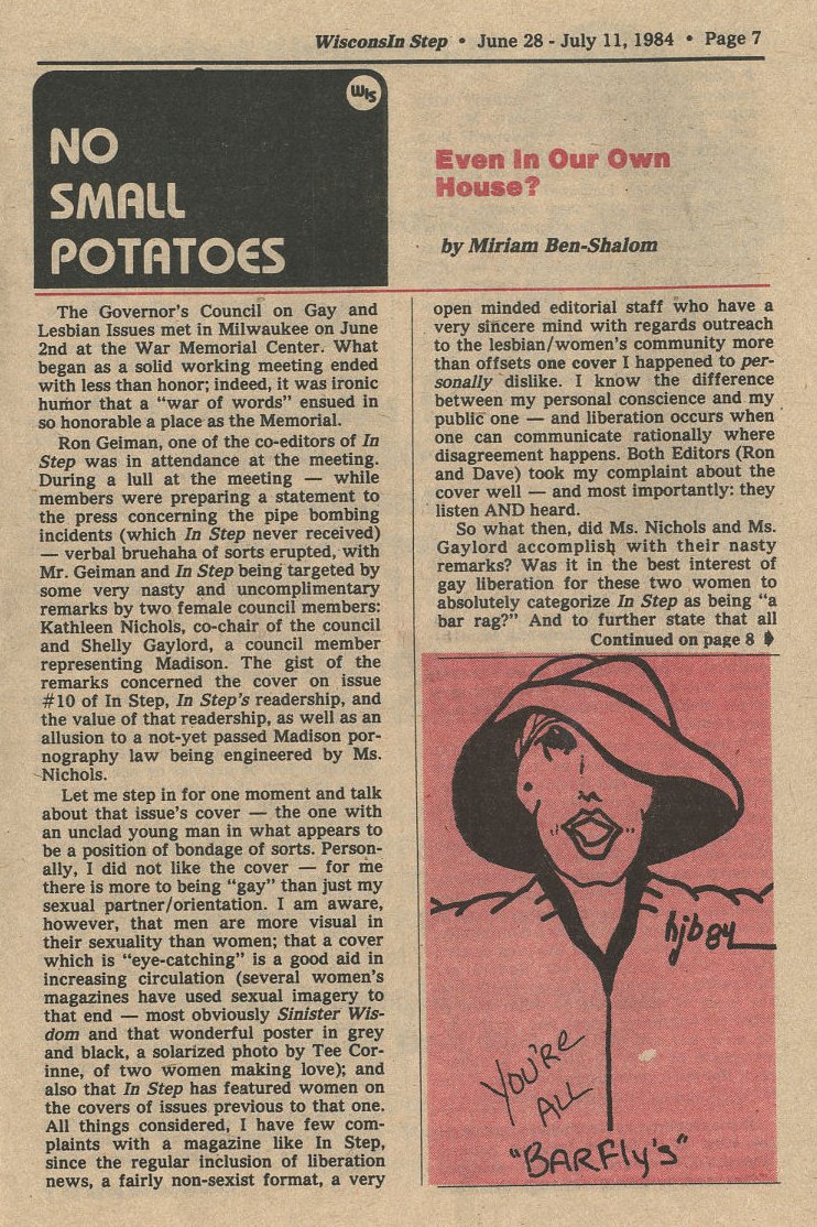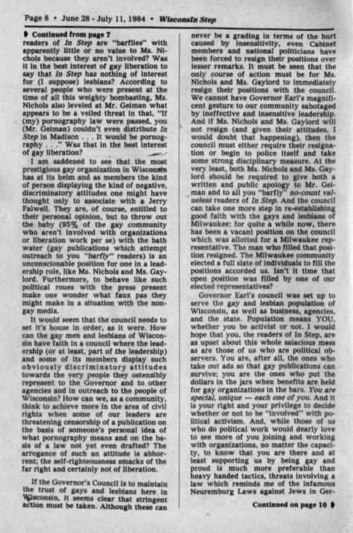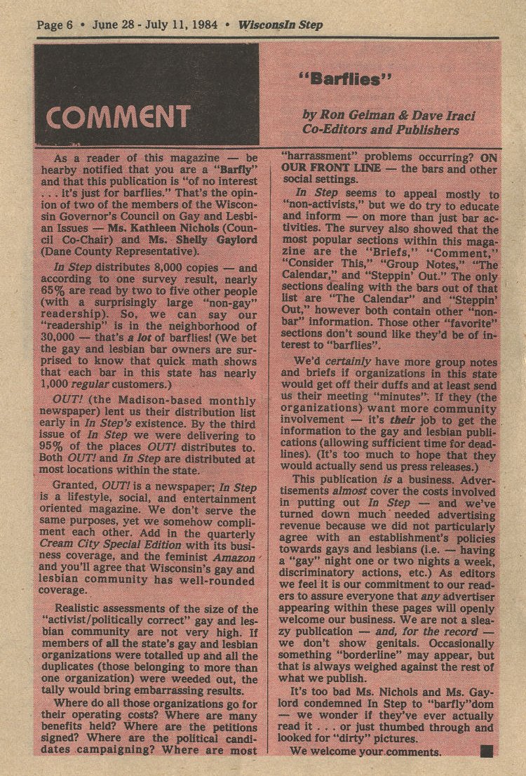 Comment: In Step readers called "Barflies" by two members of Governor's Council on Gay and Lesbian Issues: Kathleen Nichols and Shelly Gaylord