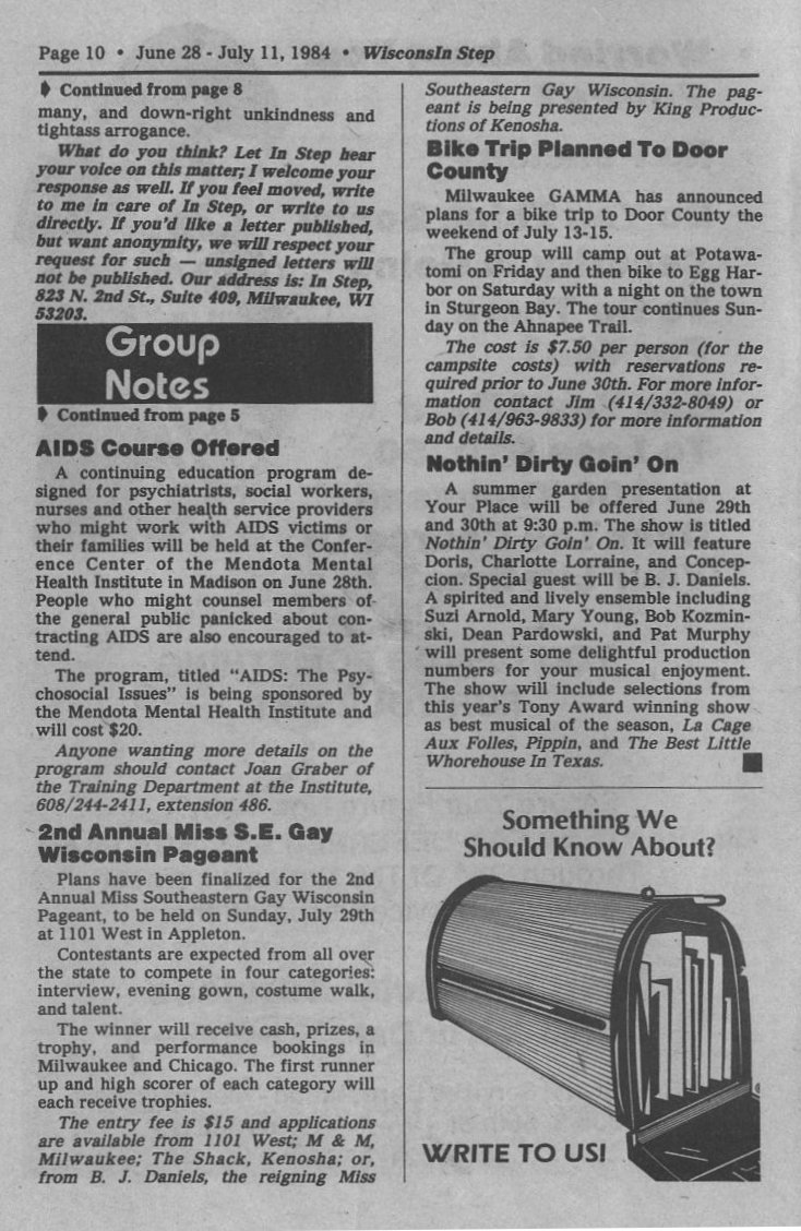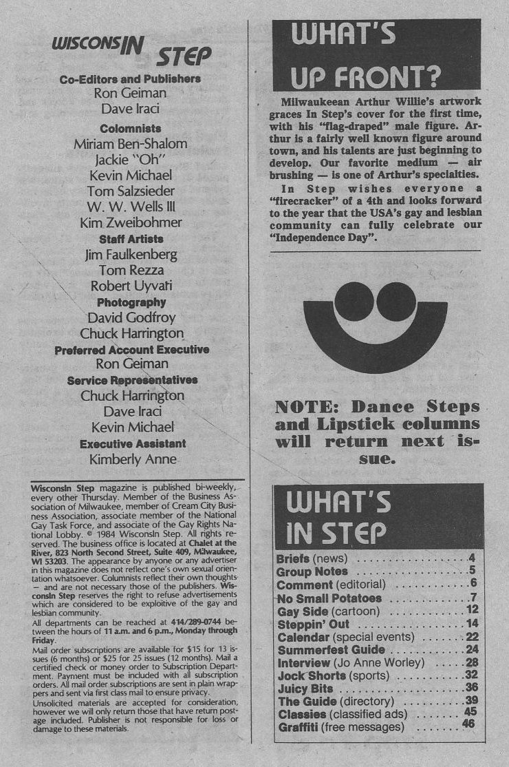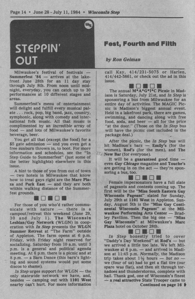 Steppin Out: Summerfest 84 highlights; WLGN (Wisconsin Lesbian/Gay Network) Summer Retreat at The Farm outside Appleton; upcming MAGIC picnic in Madison; upcoming female impersonator (drag) pageants