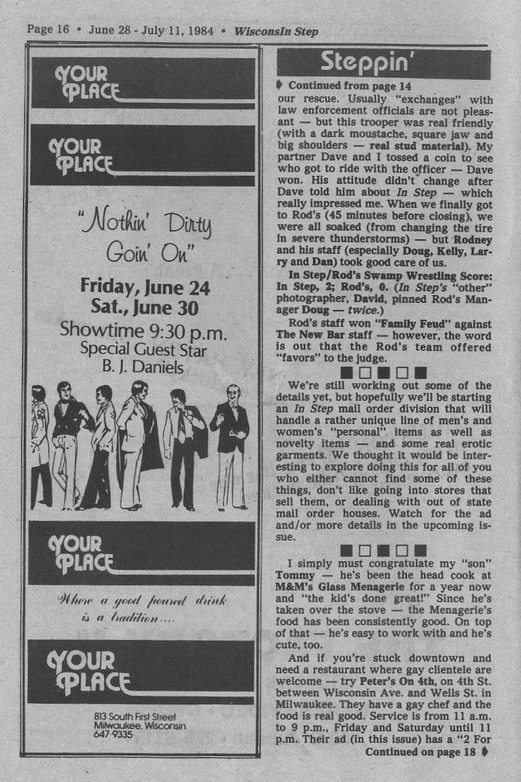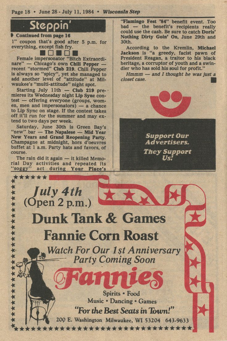 Steppin Out, concl: Club 219 hosts Chili Pepper, Lip Sync contest; Napalese grand reopening party (Green Bay); Your Place's Flamingo Fest 84 rained on + Ad: Fannies 4th, dunk tank, corn roast