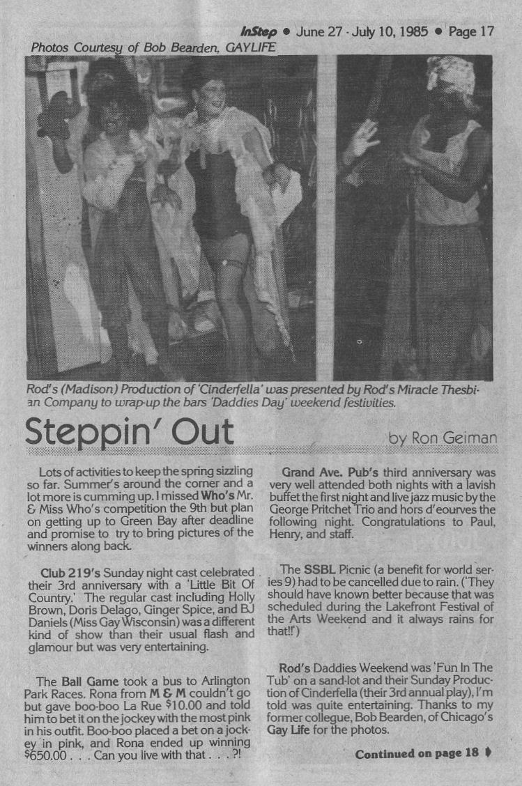 Steppin' Out: Who's Mr. and Miss contest; Club 219's Sunday Night Cast 3rd anniversary performance "Little Bit of Country"; Ball Game bus trip o Arlington Park racetrack; Grand Avenue Pub 3rd anniversary; Rod's Daddies Weekend celebration