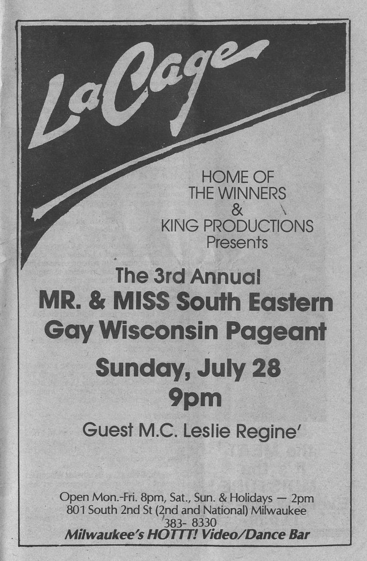 Ad: 3rd Annual Mr & Miss South Eastern Gay Wisconsin Pageant at La Cage