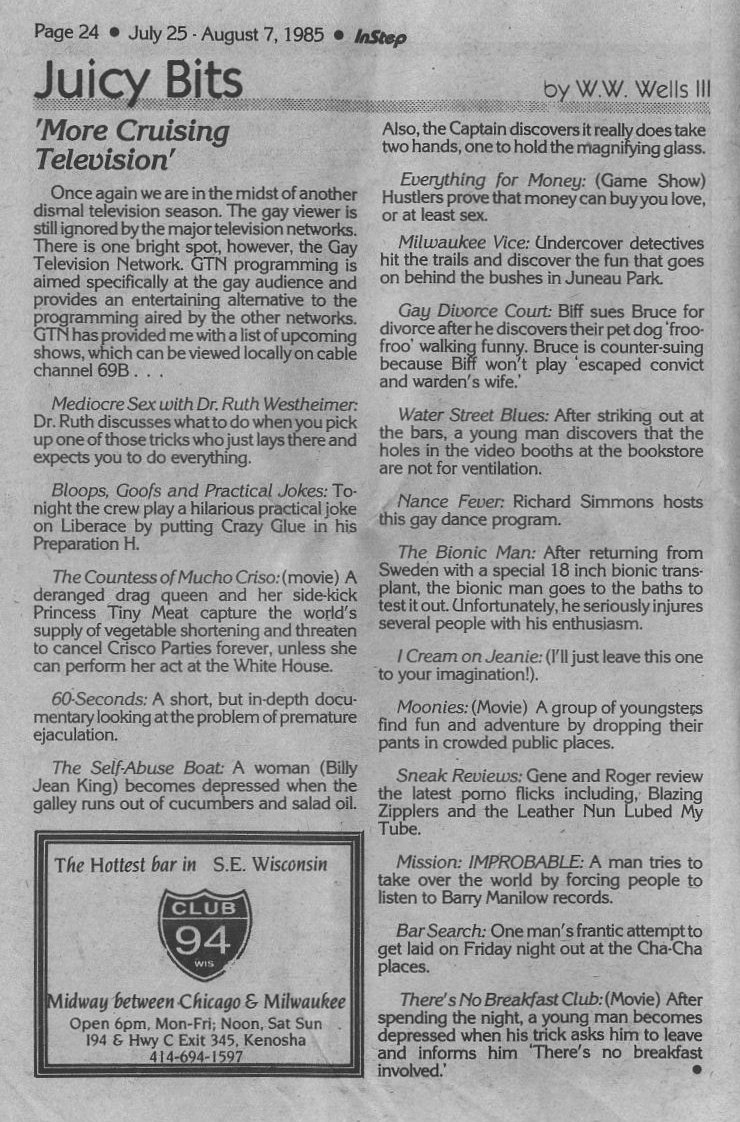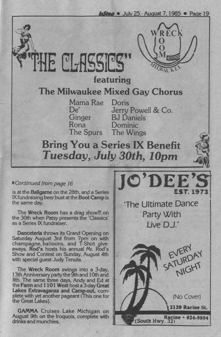 Bar news concl; + Ads: Milwaukee Mixed Gay Chorus performing at Wreck Room; Jo'Dees Racine