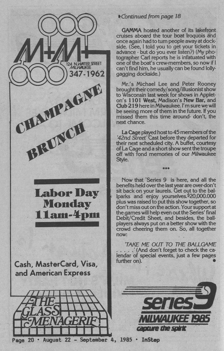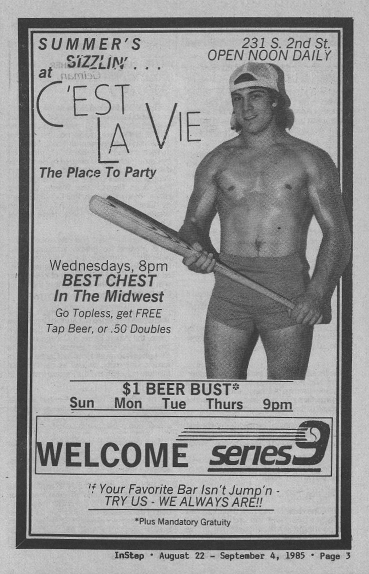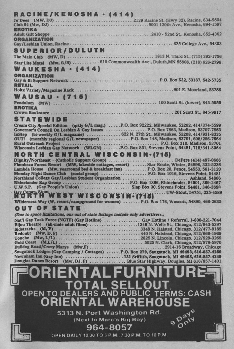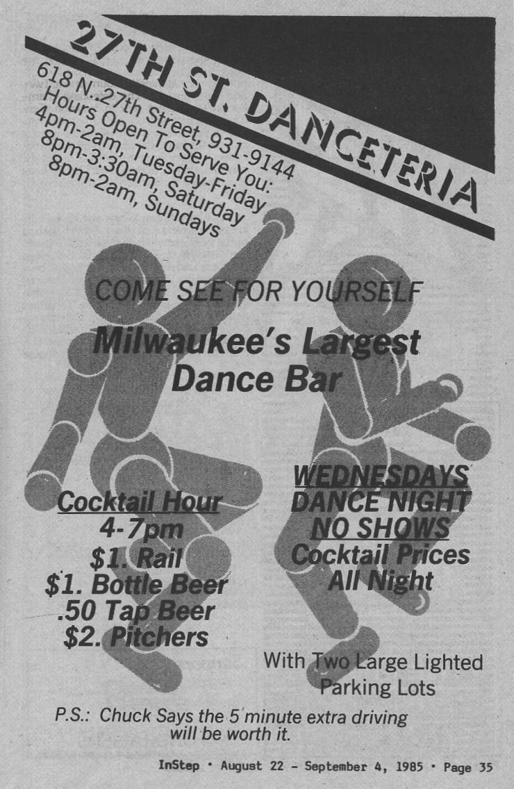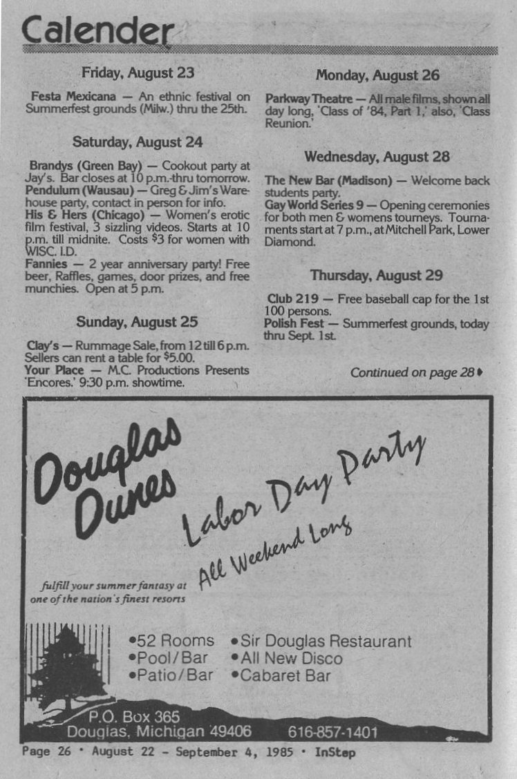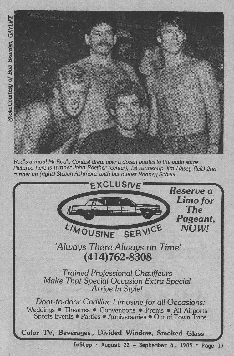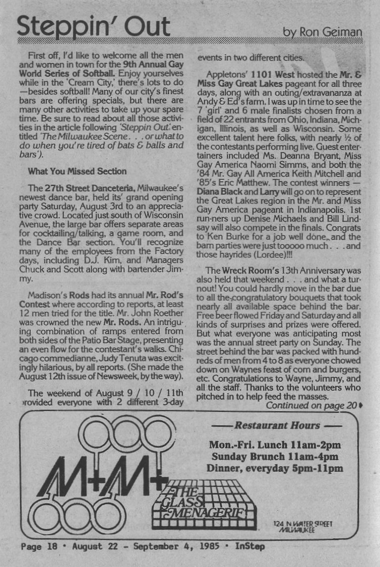 Steppin Out: 27th St. Danceteria opening; Rod's Mr. Rod Contest; Mr. + Miss Gay Great Lakes contest; Wreck Room's 13th anniversary party