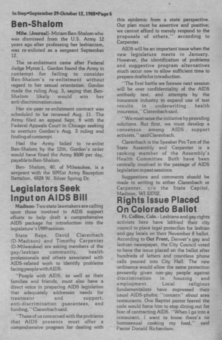 News: Miriam BenShalom re-enlisted; state lawmakers seek input on AIDS bill