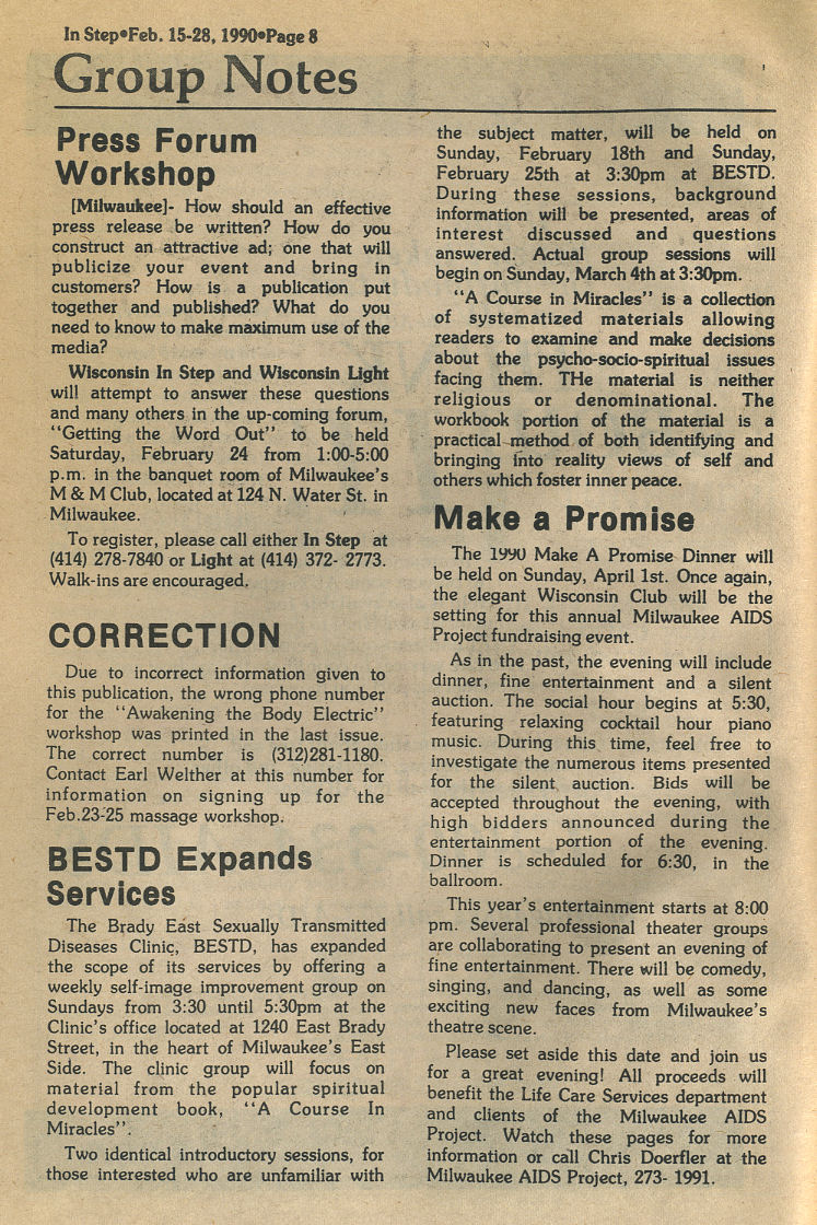 Group Notes: BESTD expands services; 1990 Make A Promise dinner for Milwaukee AIDS Project to be held at Wisconsin Club