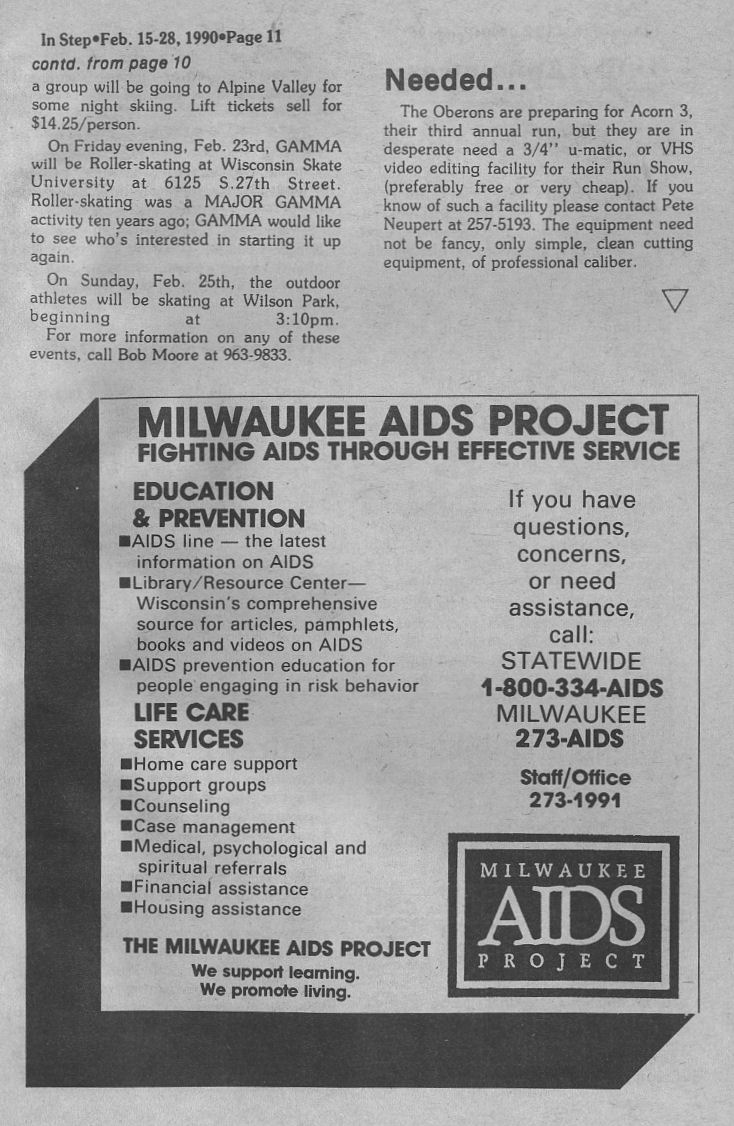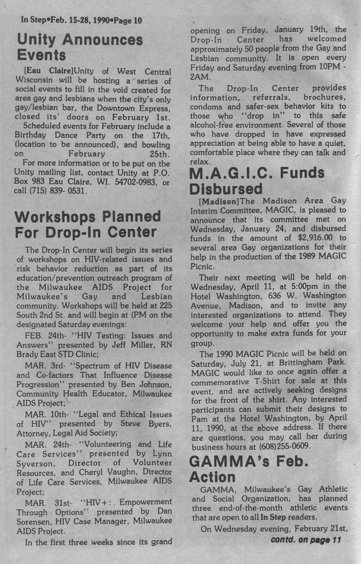 Group News, cont.: Unity announces events; Workshops planned for Milw. AIDS Project drop-in center; MAGIC (Madison Area Gay Interim Committee) $2,916 funds disbursed from 1989 MAGIC Picnic