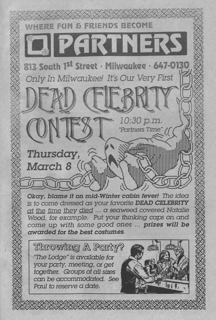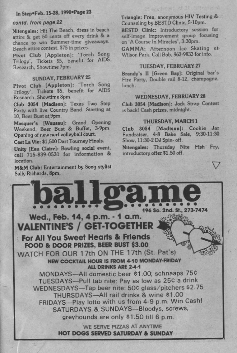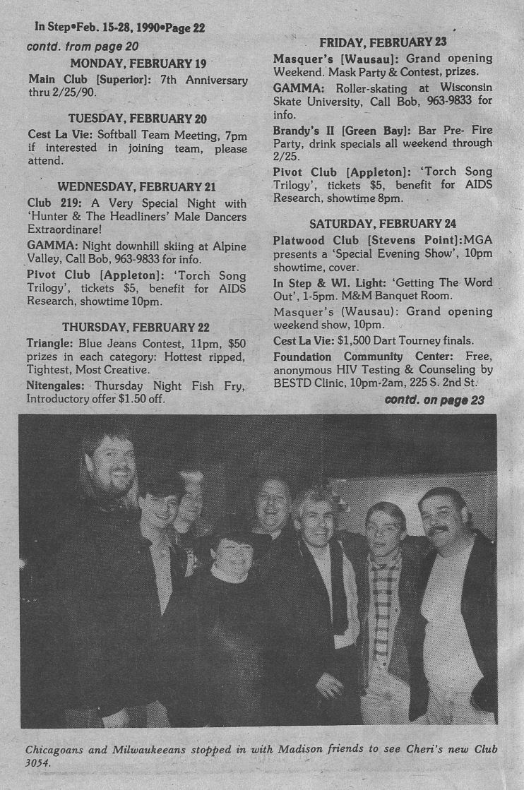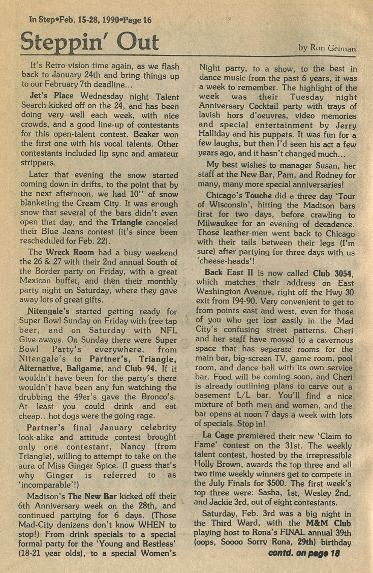 Steppin' Out: Jet's Place Talent Search; Triangle cancels Blue Jeans contest due to 10" snow; Wreck Room has South of the Border party; Super Bowl parties; New Bar in Madison celebrates 6 year anniversary; Back East II in Oshkosh renamed Club 3054; La Cage premiered 'Claim to Fame' contest; M&M hosts Rona's FINAL 39th birthday party