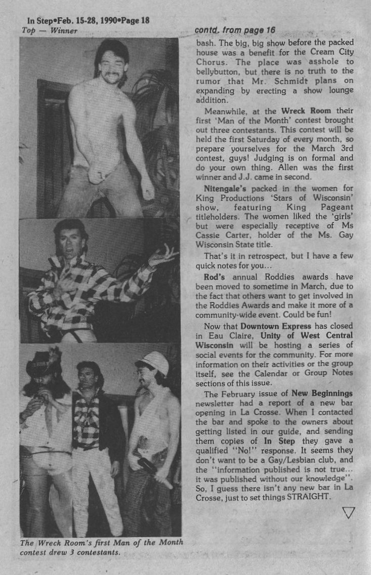 Steppin' Out, cont.: Wreck Room's Man of the Month contests, Nitegale's 'Stars of Wisconsin' show; Downtown Express in Eau Claire has closed, Unity of West Central Wisconsin will instead host events