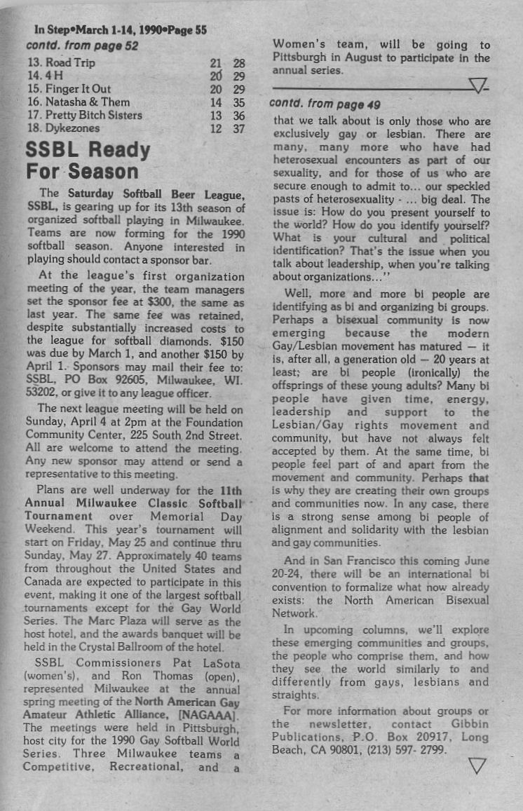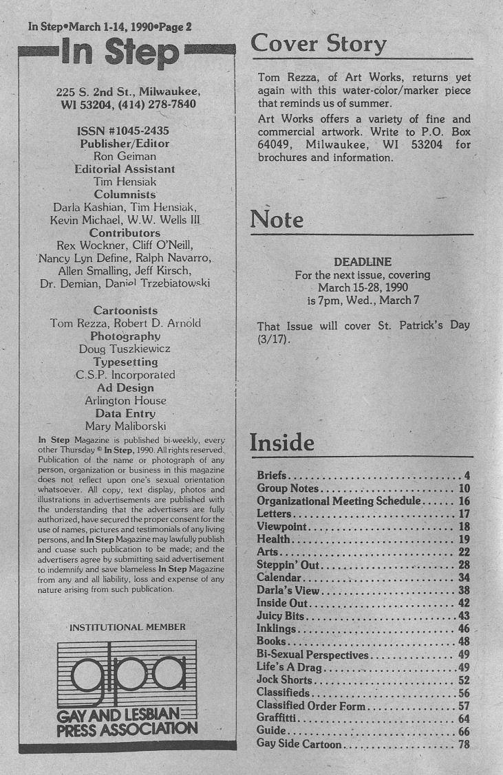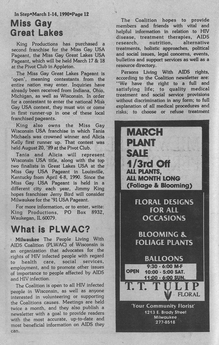 | Group Notes, cont.: new Miss Gay Great Lakes title and pageant; What is PLWAC: People Living With AIDS Coalition (page 12)
