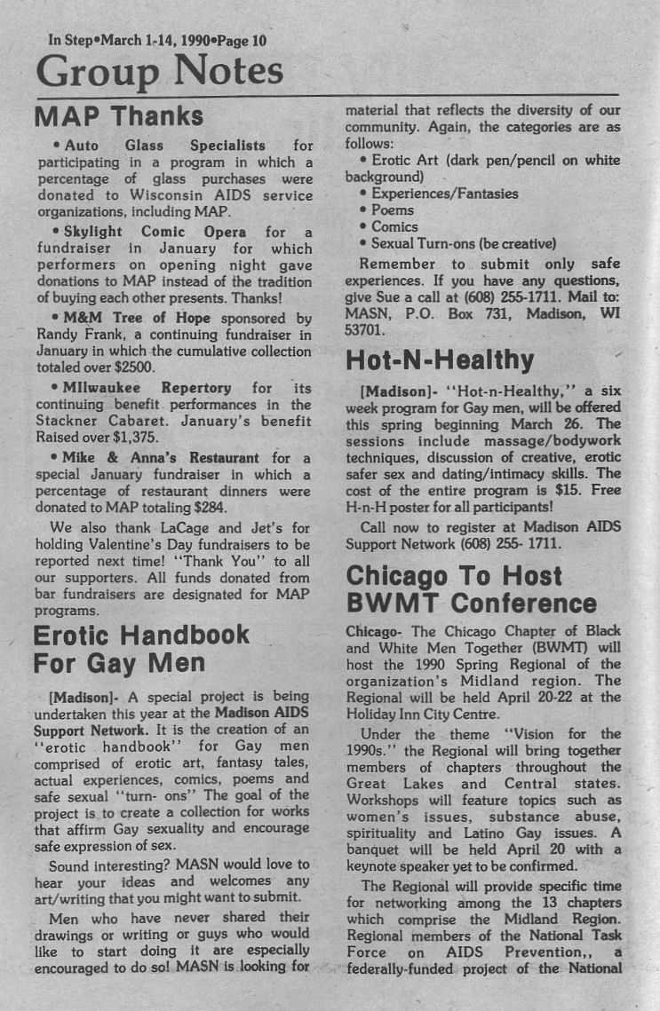 | Group Notes: MAP thanks various groups; Madison AIDS Support Network (MASN) project; Hot-n-Healthy program in Madison; BWMT conference in Chicago (page 10)