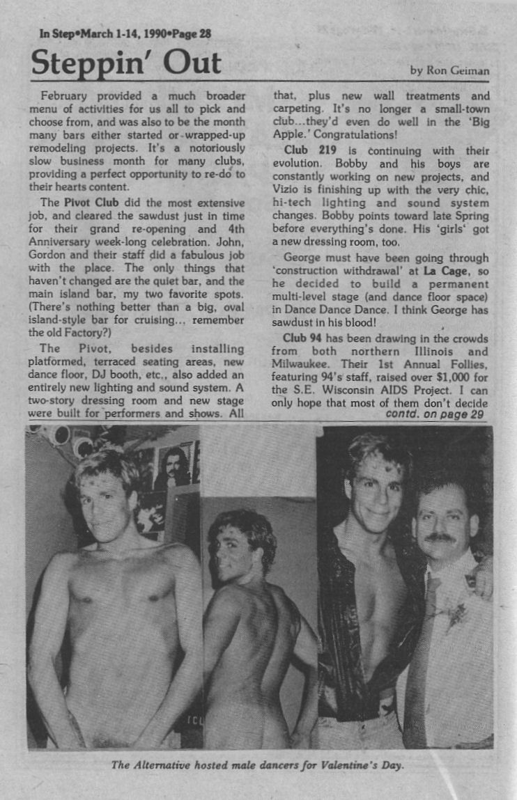 | Steppin' Out: Pivot Club held grand re-opening and 4th anniversary; Club 219 continuing its evolution, "finishing up very chic, hi-tech lighting and sound system"; La Cage builds multi-level stage in Dance Dance Dance; Club 94 drawing crowds. + Photos: The Alternative hosts male dancers for Valentines Day