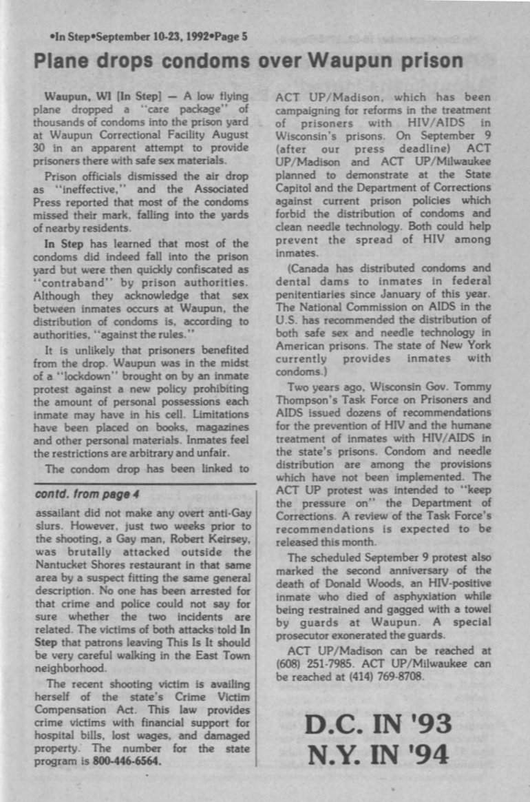 Plane drops condoms over Waupon Prison; Act Up/Madison