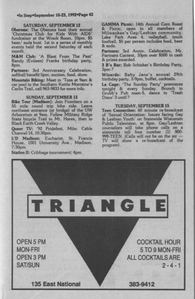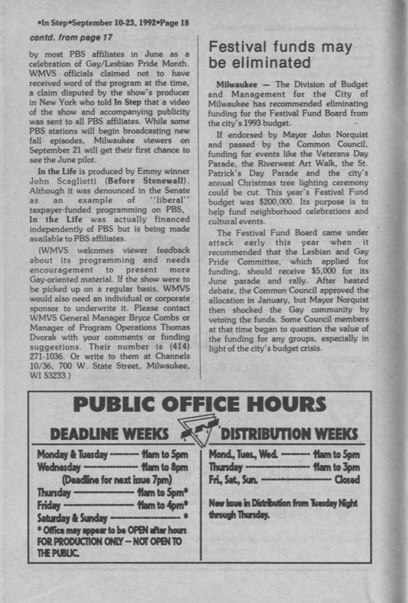 'In The Life' hosted by Kate Clinton on WMVS; Mayor Norquist cuts funding for Pride Parade.