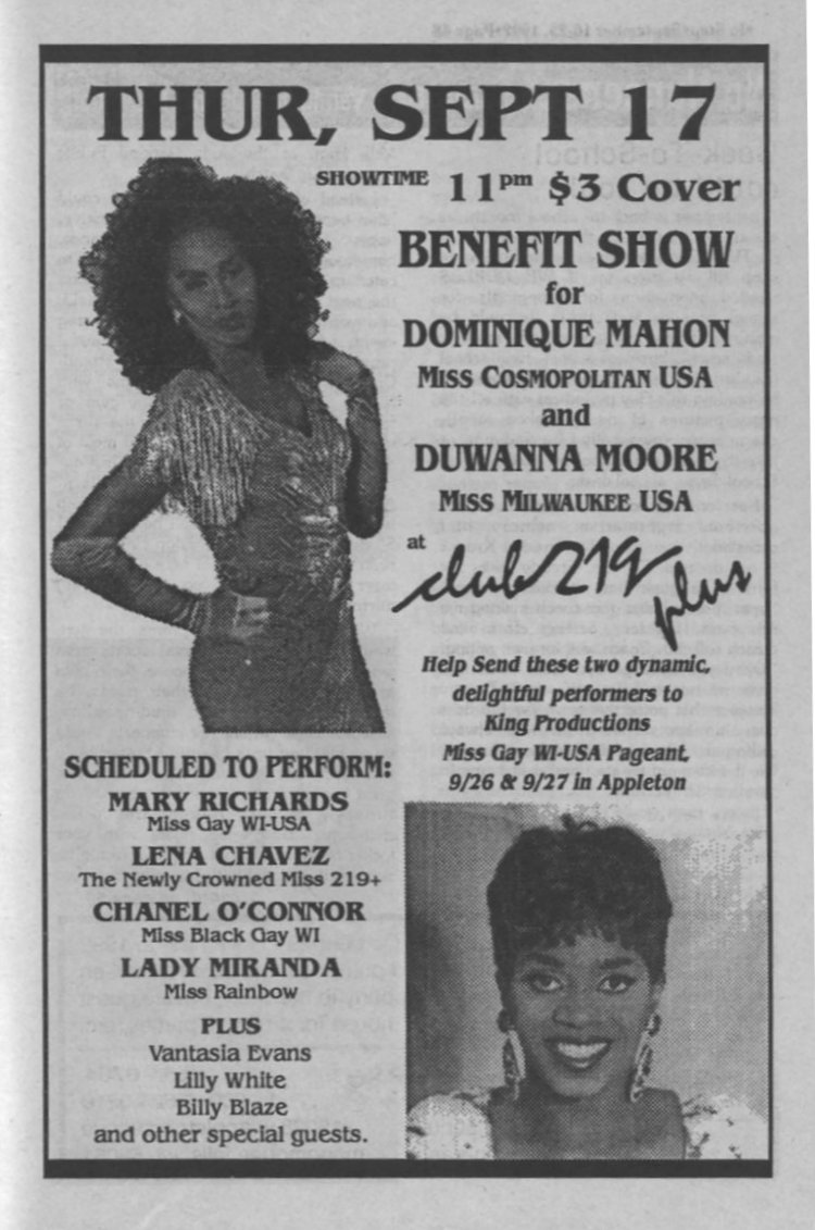 Ad: Club 219 Benefit show for Dominique Mahon Miss Cosmopolitan USA and Duwanna Moore Miss Milwaukee USA