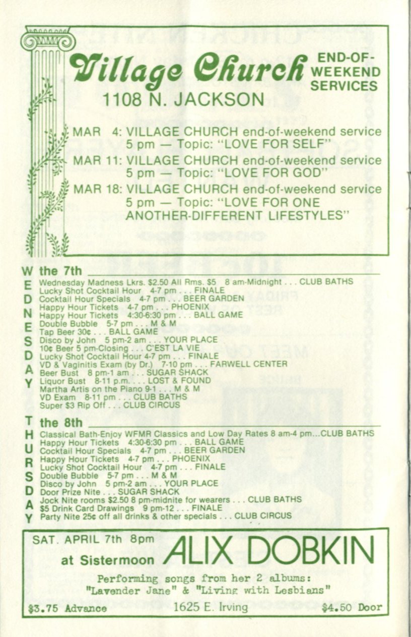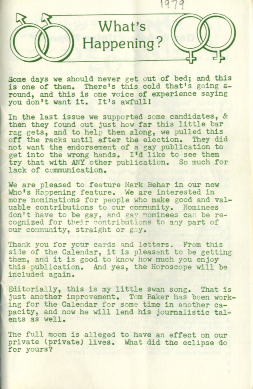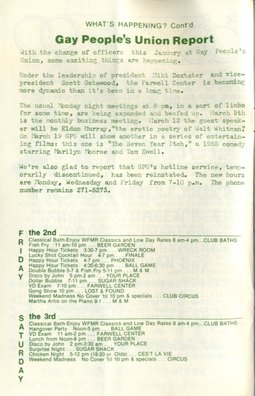 What's Happening, cont: Gay Peoples Union report: President Miki Doxtater and vice president Scott Gatewood are making the Farewell Center more dynamic, with rejuventaed Monday night meetings and reinstated hotline + Daily events