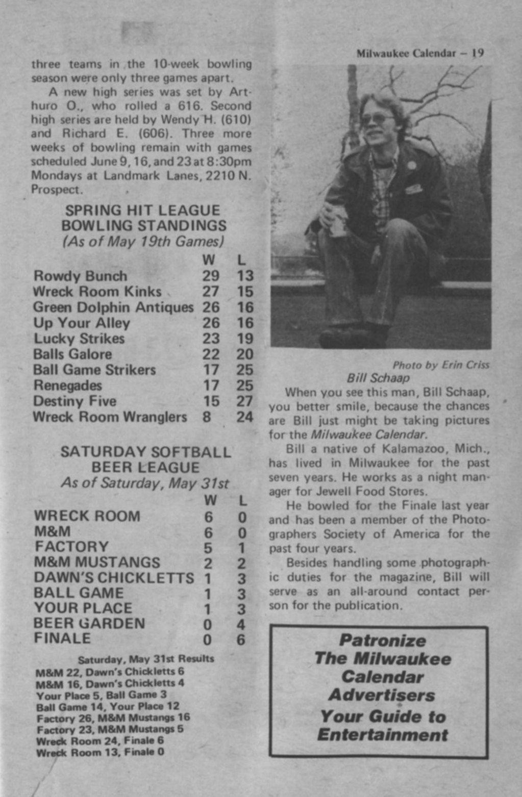 Sport scores (cont from page 14) + photo of Bill Schaap, photographer for Milw. Calendar