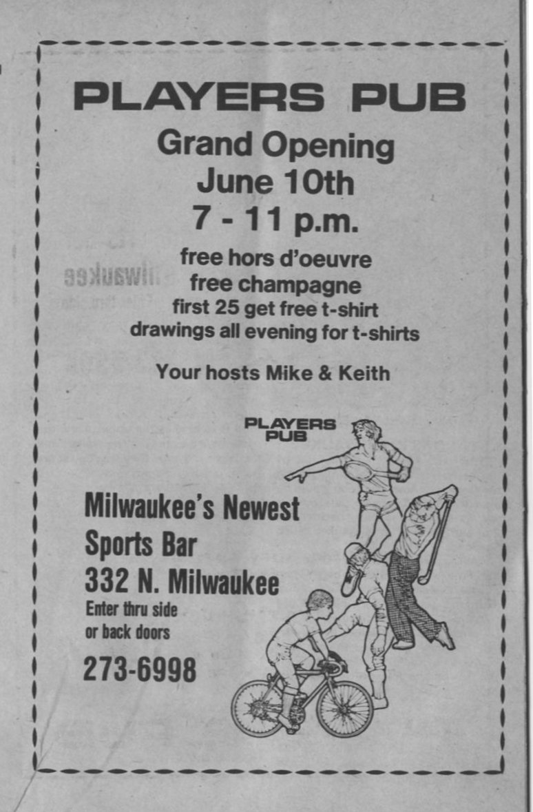Advert for Players Pub, "Milwaukee's newest sport bar"