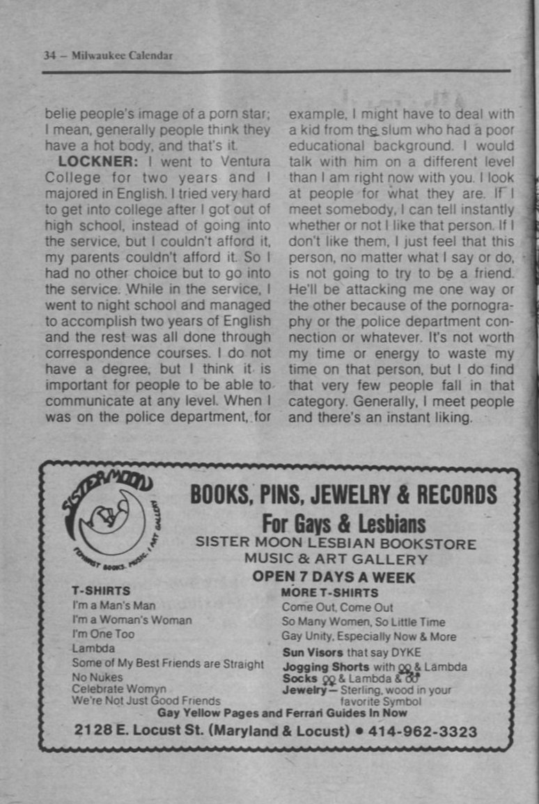interview with Lockner, cont + Advert for Sister Moon books etc.