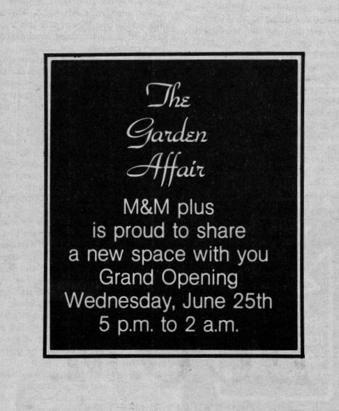 Advertisement for M&M's "Garden Affair"- opening of its outdoor garden